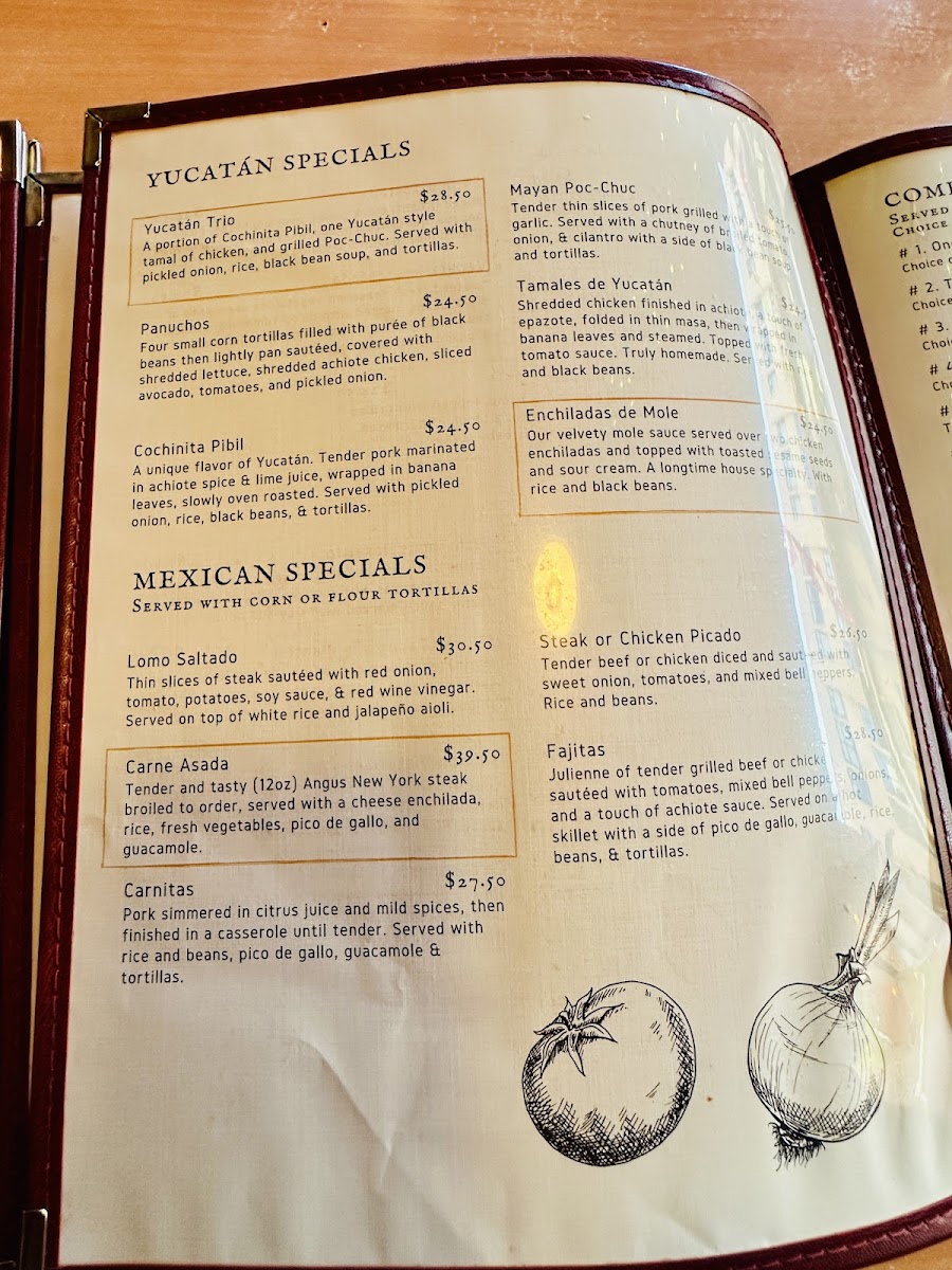 Thin slices of tender beef, potatoes, bell peppers, and tomatoes all simmered in Yucatan spices. Served with black beans, rice, and tortillas.