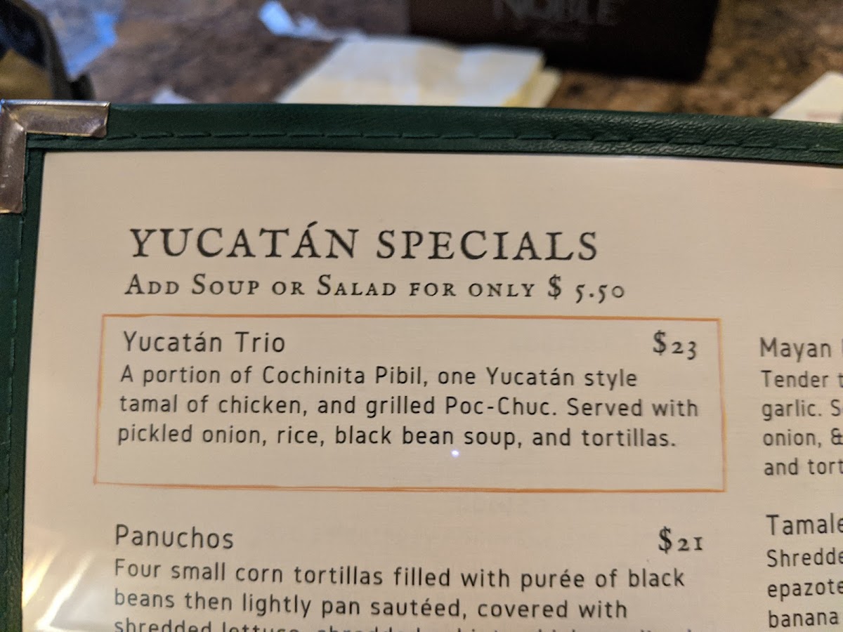 Filet of sole marinated in achiote and epazote. Wrapped in banana leaves with red bell pepper, onions, and tomato, then finished in the oven. Served with black bean soup and Mexican rice.